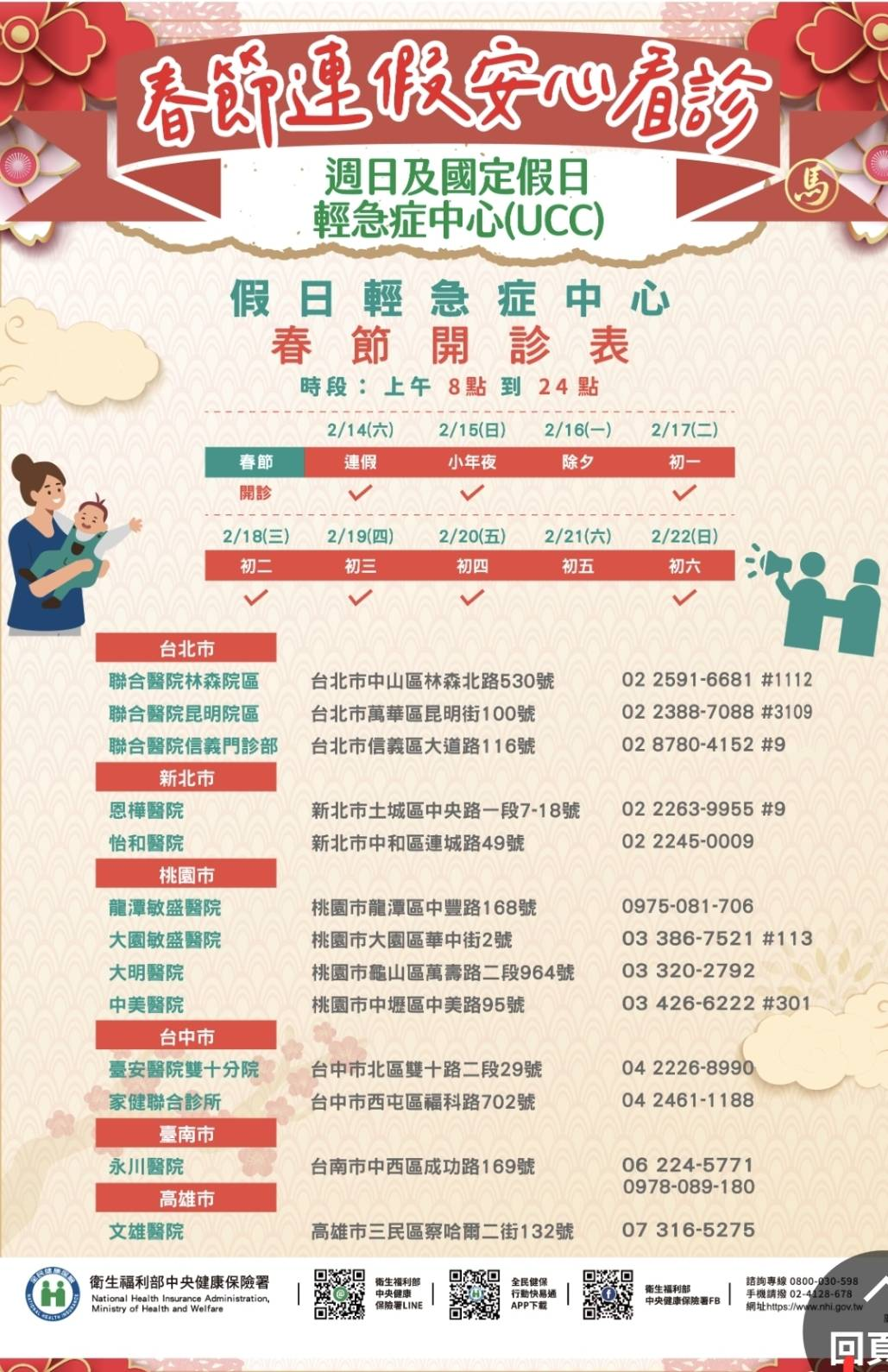 健保署於春節期間設有「UCC 假日輕急症中心」